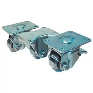 Furca dubla sudata din otel, rulment cu role conice si rulment cu bile in capul pivotant, niplu gresor, ax din surub filetat. Roata din fonta, rulment cu bile.